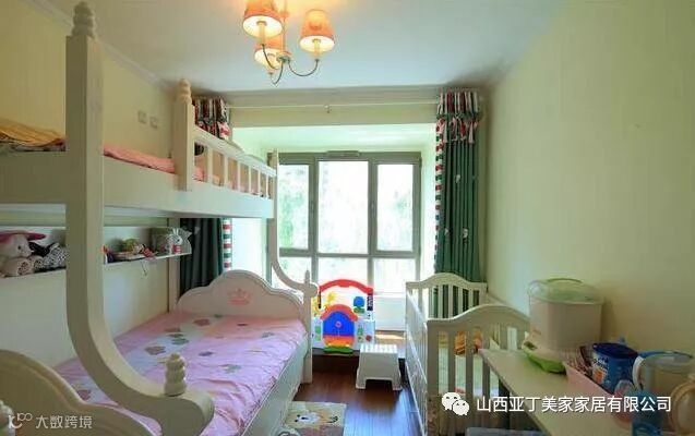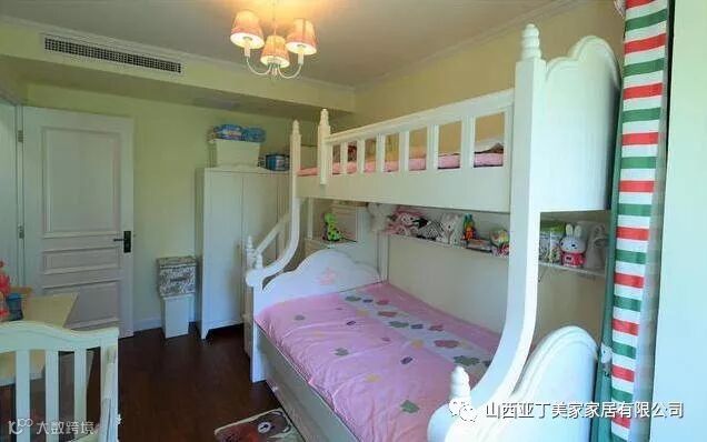这间是儿童房,相对来说就清新活泼很多,墙面是淡黄色的,家具都是白色的。