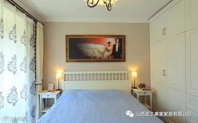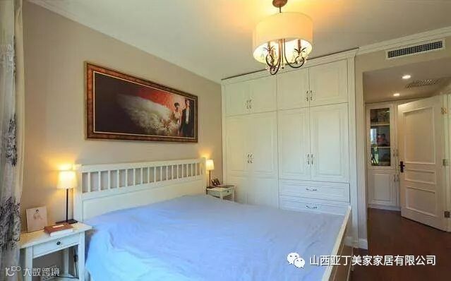 这间是主卧,床的样式很简单,旁边是定制的大衣柜,整体搭配很素雅。