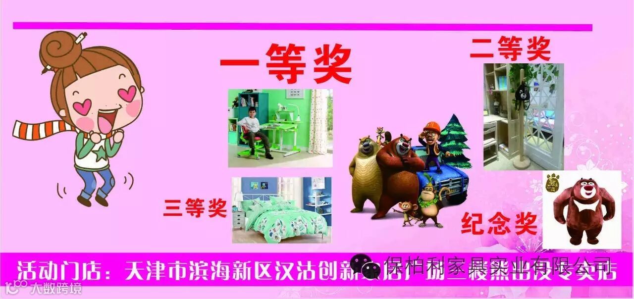 3.此次活动一等奖价值1799元星博学习桌一张,二等奖价值880元芬兰松衣帽架一个,三等奖价值488元床上四件套一套,纪念奖十名奖熊出没公仔一个。