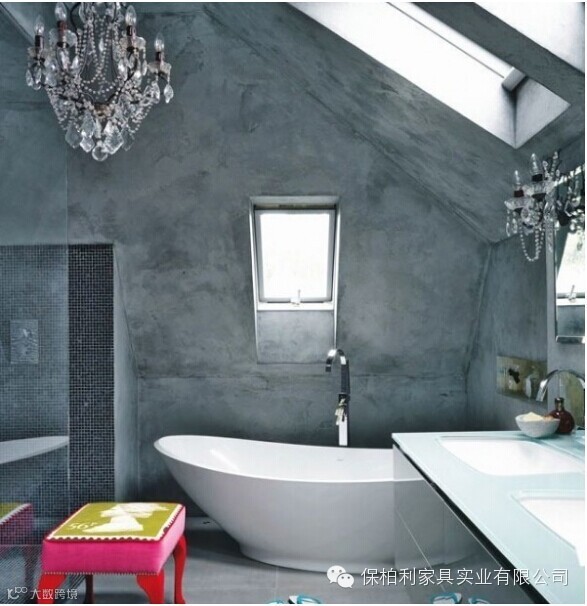 这间浴室是华丽而高冷的。古典的水晶灯配上工业的赤裸水泥墙,这就是奢华和现代碰撞完美结合,整个空间充满艺术的碰撞。