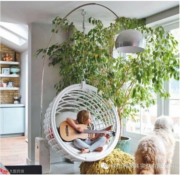 在客厅靠近凉台的一角,我们看到了一个与自然完全融合的空间设计。巨大得一整株的绿色植物,感觉像土地的毛绒凳子,以及巨大得圆形休闲吊椅都能够将这一块区域的整体明亮感提升,在这休闲也是一种不一样的享受。