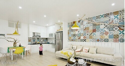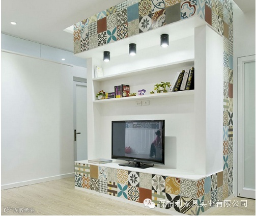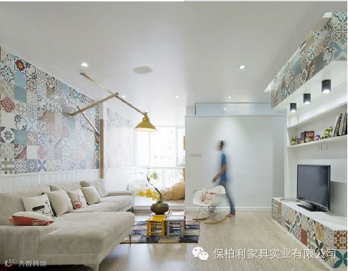 马赛克壁纸是电视墙上最大的亮点,像这样的由各式图案组成的马赛克壁纸点缀在各个房间,让家居整体感到非常和谐统一。