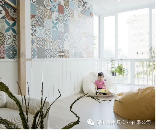 阳台的一角俨然成了小孩的娱乐空间,孩子在家也能有自己的专属儿童乐园。因为小孩喜欢活泼乱跳的,所以没有很多硬质的东西,避免孩子受伤。