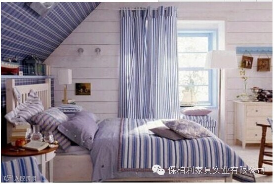 蓝白搭配的基调令人眼前一亮,清新淡雅的英伦风扫尽斜面屋顶给人的压抑感,窗帘、靠枕等布艺的选用给人十分舒适的感觉。窗户在床的一边透着明媚的阳光,生活在这里感到悠闲惬意。