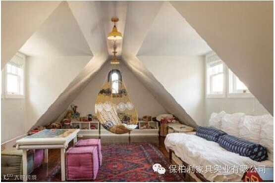 低矮的阁楼可以改造成孩子娱乐的场所,三角斜面地带设计成玩具的收纳空间,利用房顶的高度装上了吊椅,地板铺上地毯,安全有隔音。在一侧靠窗的下方,添置了软绵绵的卧榻,孩子玩耍累了可以休息。