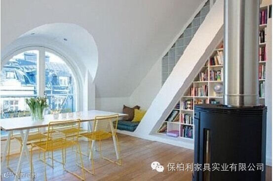 阁楼往往是尖顶的,墙面呈现出倾斜的角度,给设计增加了许多困难。一些斜面处是不利于作为活动空间的,因此收纳成为斜顶空间里最常见实用的设计。