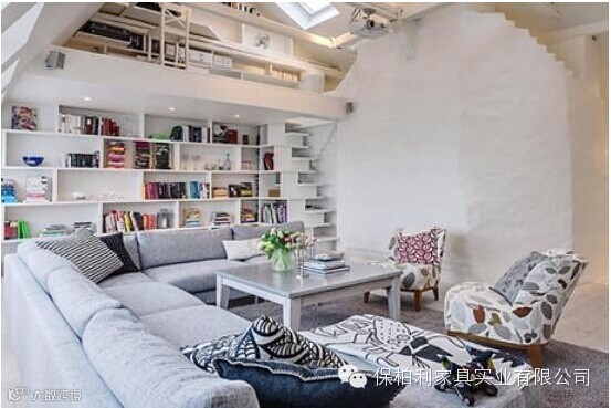客厅墙面扩充成为白色收纳层架,有效地利用了斜面的空间,成为了大气的沙发背景墙的同时体还把楼梯设计为一体,更向上扩展成为阁楼式书房,高效的创造空间,十分实用。加上L型的大沙发与地毯,这种灰白色调使客厅显得格外时尚大气。