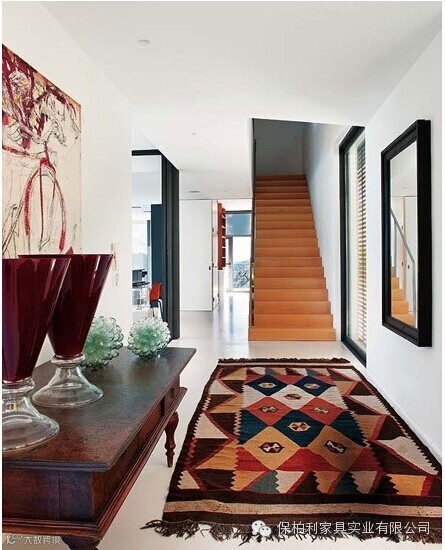 在玄关处放上地毯形成过渡区,不但可以防滑踏脚,丰富的图案更活跃了玄关的气氛。大面积的镜子方便出门时整理着装,也从视觉上扩大了空间感。正对着玄关的楼梯延伸了视线,也拓宽了空间。