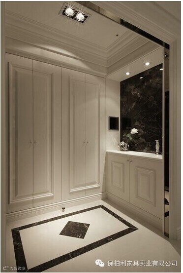 考虑到穿堂煞的风水问题,设计师利用黑白拼花地板,以黑金峰大理石搭配白色线板鞋柜打造端景墙