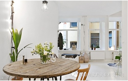 原木拼接的圆形餐桌朴拙的厚重感,铁艺灯罩的轻工业风格,与周围的直线条,纯白单色调,形成了矛盾之美;绿色植物、淡黄小花又将矛盾巧妙融合化解。