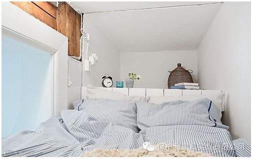 窄小的空间得到了有效的利用,平台增加了房间的层次感,条纹床品拉伸了空间感,白色的基调使空间显得洁净而安宁;一段原木隔断又为房间增添了一份暖意,一场美梦即将在这里开始。