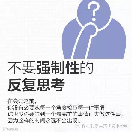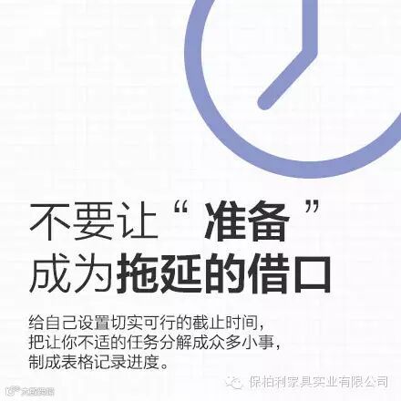 不要让“准备”成为拖延的借口,给自己设置切实可行的截止时间;不要打算一口吃成胖子,这只会使你产生“再等等”的念头;不要强制性的反复思考,你没有必要从每一个角度检查每一件事…提高效率,关键在于改变习惯。