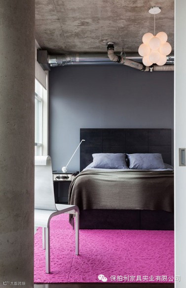 深灰色的墙壁,深色的床铺,水泥质地的天花板,暴露的水管,作为卧室仿佛太冷冽。所以,在地面上,选择了一款枚红色地毯缓解这种情绪。