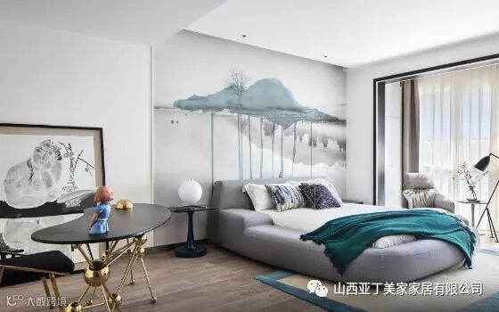 主卧室的面积很大,独立的阳台封闭后,摆上沙发及小茶几,随意享受愉悦的生活。无论是灰色的布艺床,还是中国画装饰的床头墙面,抑或是造型优雅的小桌,每一处都尽显设计师独到的设计手法。