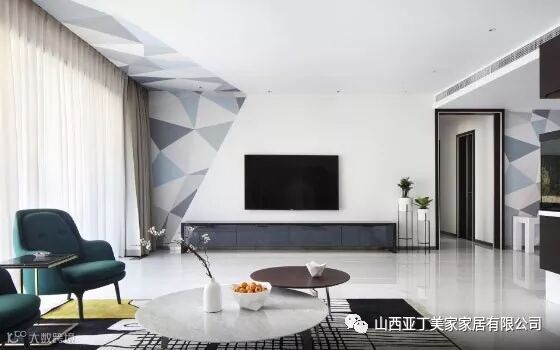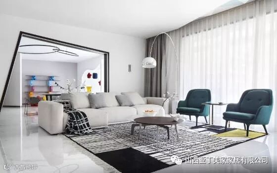 一组三人位的灰色布艺沙发,搭配两把深绿色的单人双发,黑色与白色的圆形茶几,简约到极致的设计感带来与众不同的个性空间,就连地毯的选择也是非常的到位。