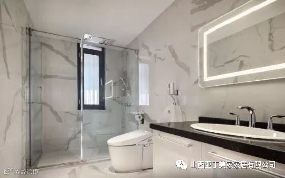 宽敞的卫生间装修依然是简洁到极致,灰色纹理的白色瓷砖铺满墙面和地面,搭配白色的浴室柜及卫浴洁具,让卫间显得格外清爽。唯一的色彩搭配就是黑色大理石材质的浴室柜台面,搭配白色的台盆和银色的水龙头,极简的设计尽显主人非凡的品位。