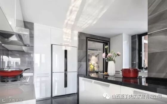 黑色与白色组合而成的厨房空间,大量使用具有镜面效果的装饰材料,让这样的厨房令人不忍去破坏,害怕烹饪时产生的油烟毁坏这美妙的画面。