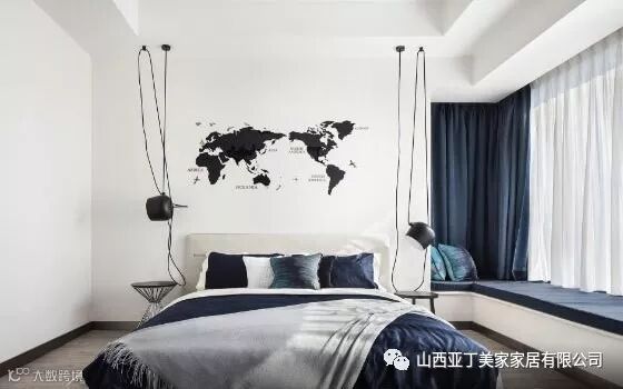 次卧室的装饰相当简洁,蓝色的床上用品与窗帘让这间卧室显得格外宁静而舒适,床头两头随意吊挂的吊灯成为空间的焦点。