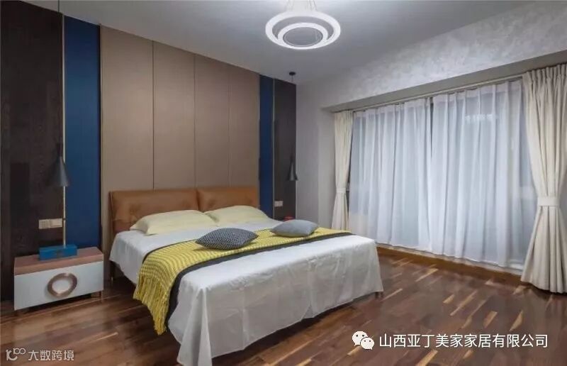▲卧室整体现代温雅的空间,软质床头靠背提供了舒适的睡前体验,双环状的吊灯也让卧室显得层次温馨好自然。