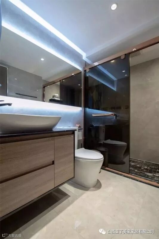 ▲卫生间在镜子背后都做了背光处理,在灰色地砖基础,淋浴区地面是黑色的地砖,结合玻璃推门,整个空间都显得充满了时尚优雅好高档。