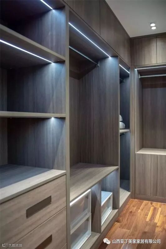▲独立的衣帽间的衣柜都是开放式的,柜子顶部还装了灯带,这样找衣服会更加方便。