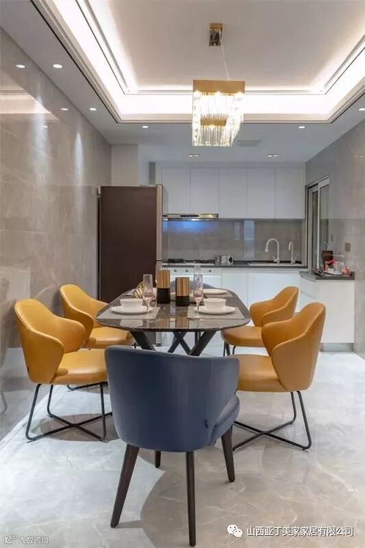 ▲在大理石质感墙地砖上,搭配上石材餐桌台面,橙色与蓝色的皮艺餐椅,一盏水晶吊顶,带来了高档质感的用餐氛围。