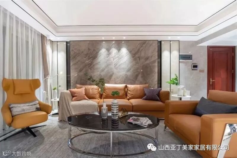 ▲沙发墙也是大理石质感的,两侧还有边框造型,多层天花吊顶也加上了线条显得更加有层次感,搭配上橘色的皮沙发,整个空间显得端庄而又活力优雅。