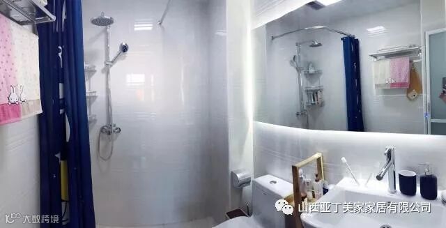卫生间实在是太小了,所谓的干湿分区也只能浴帘来隔断了。每个空间都不能浪费,马桶与浴室柜之间的收纳架,浴镜后面还有收纳练墙砖和地砖三色分明,皆为宜家简约风格色系的完美运用。用浴帘的淋浴房是小户型卫生间做干湿分离最好的选择,节省空间,效果也很好。