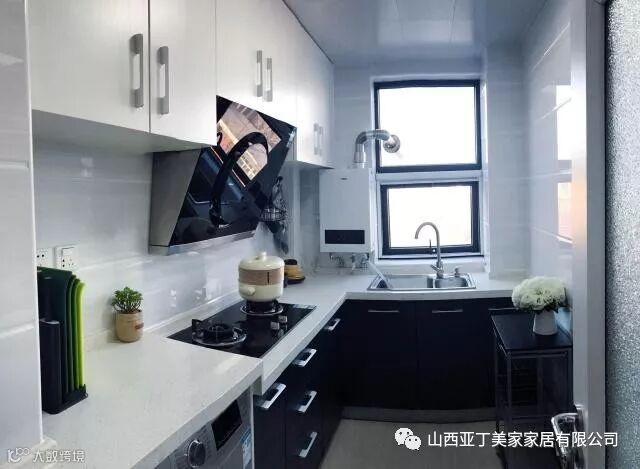 厨房在入门左侧,黑白分别的橱柜设计,从图片上看别有一番简约风情。厨房只有那么窄窄的一点空间,但麻雀虽小五脏俱全,洗衣机都放在这里呢,在闲适的周末给一家人做一顿香喷喷的大餐也是极好的。