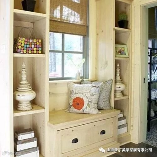 飘窗的设计还是比较多的,在窗户边上做了两个立架。做成了放置柜,可以放置很多物品。这样的装饰不但好看还可以有很大的收纳作用。底下的柜子可以用来当坐凳,上面放置两个靠垫,在上面可以非常舒适的休息。
