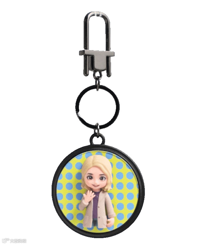 1.钥匙扣为圆形设计,主体颜色为黑色,直径约53.3.mm,厚度约13mm,采用ABS材质制成,定制人像高度约为3.5cm。