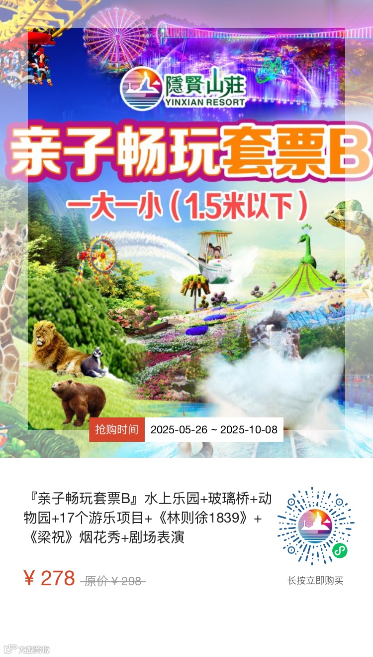 【提前预定】亲子畅玩套票B,入园门票+水上乐园+玻璃桥+动物园+17个游乐项目+《林则徐1839》+《梁祝》烟花秀