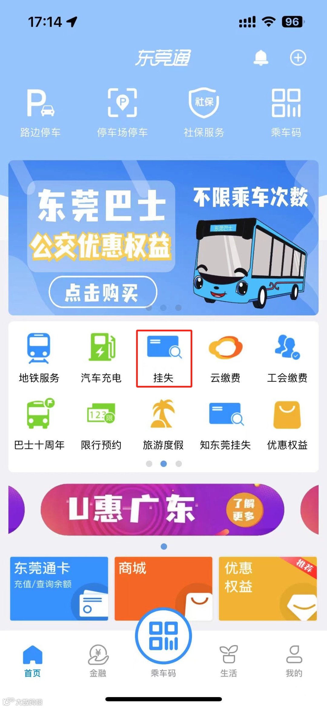2.打开东莞通APP首页,进入“挂失”功能,选择“挂失补办”窗口
