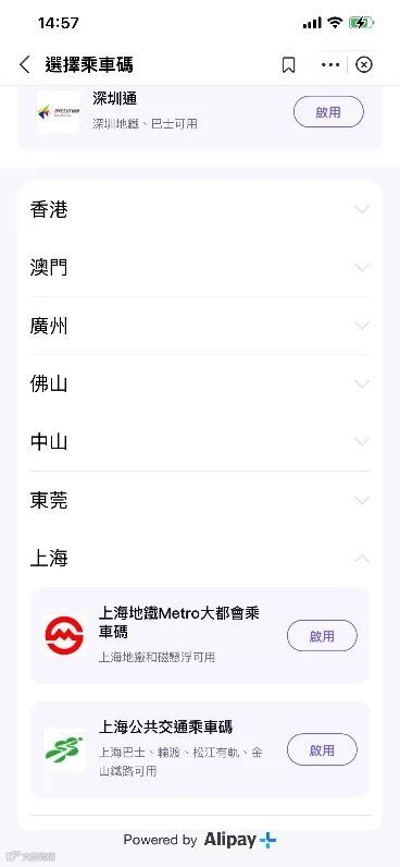 在乘车码页面上方点击“切换”,即可选择已开通使用的不同城市的乘车码,目前除了东莞,上海、广州、深圳、佛山地铁公交,以及中山和澳门公交都可以使用AlipayHK支付车费。