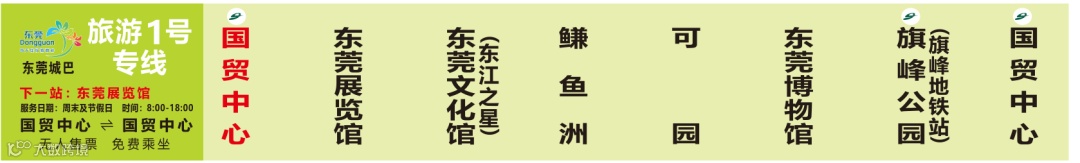 国贸中心(市民中心侧)、东莞展览馆、东莞文化馆(东江之星)、鳒鱼洲、可园、东莞博物馆、旗峰公园(旗峰地铁站)、国贸中心(市民中心侧)