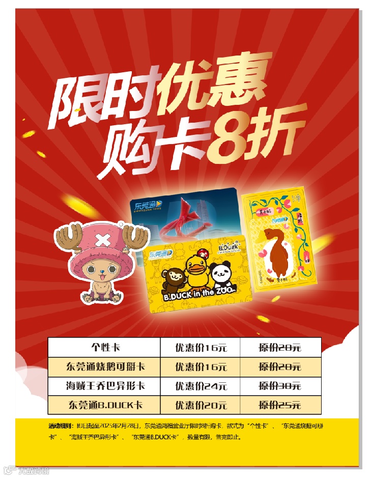即日起至2025年2月28日,东莞通新鸿福营业厅限时8折购卡,款式为“个性卡”、“东莞烧鹅可掰卡”、“海贼王乔巴异形卡”、“东莞通B.DUCK卡”。