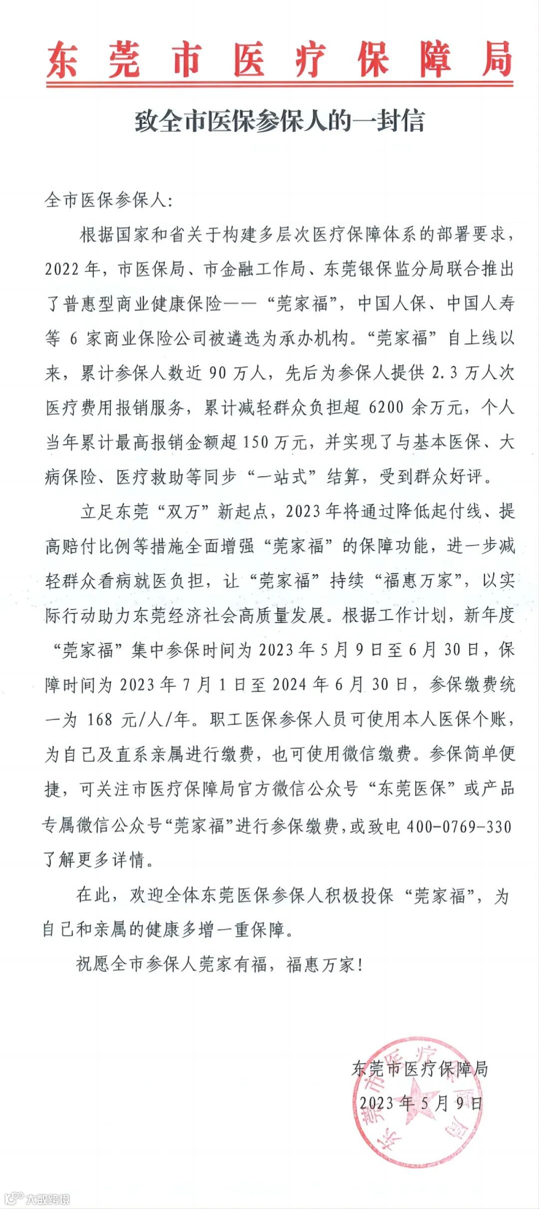 | 保障内容:“莞家福”衔接医保,医保报完还能报!每人仅需168元,最高享受330万+的健康保障!