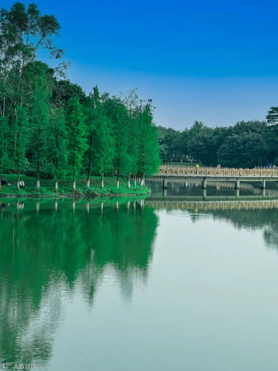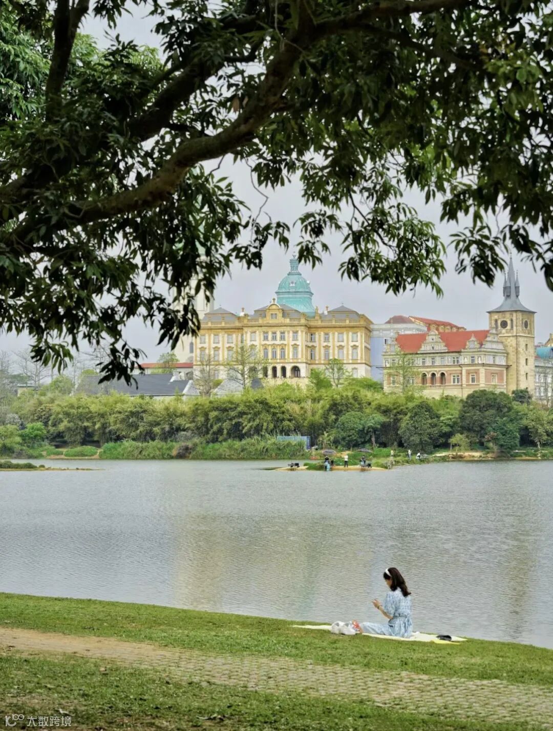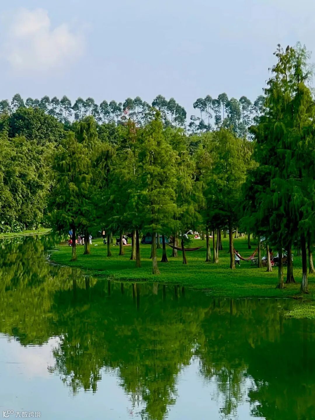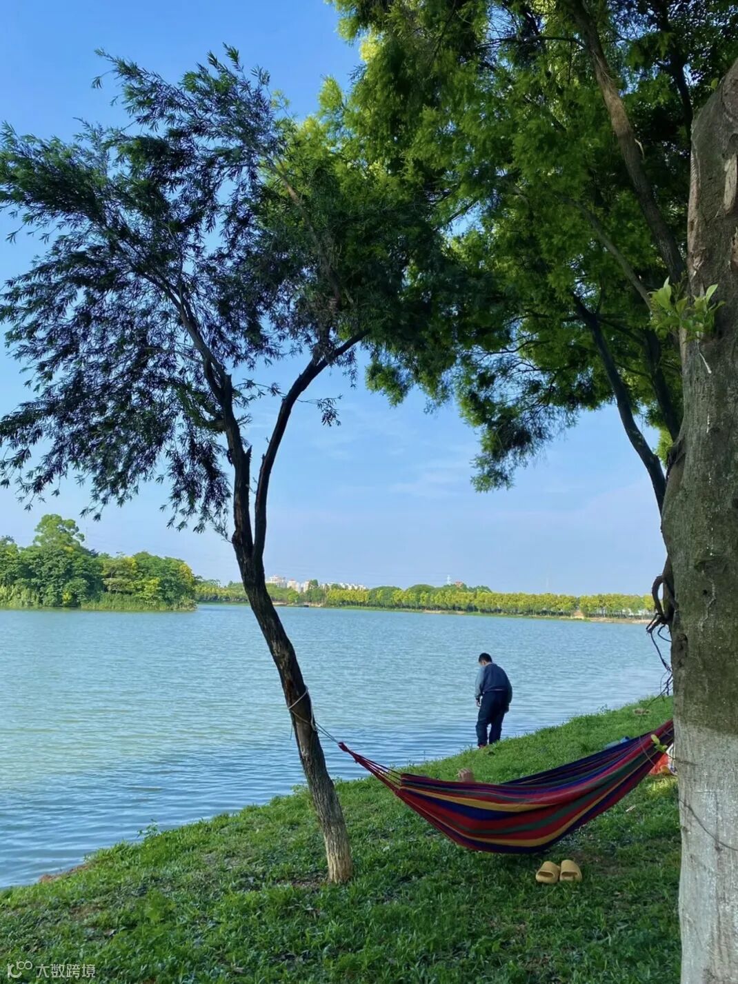 在超大人工湖旁驾一张吊床