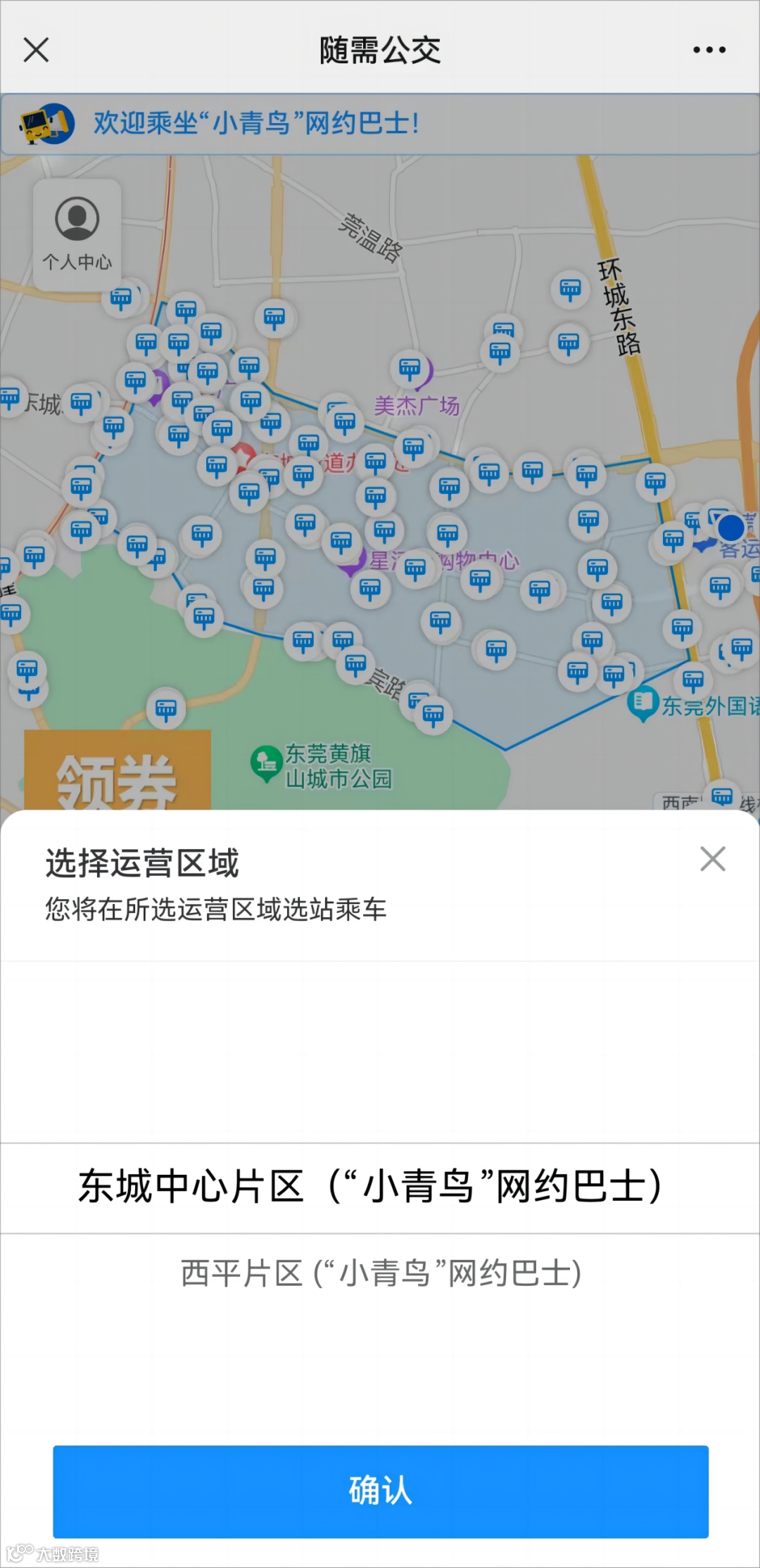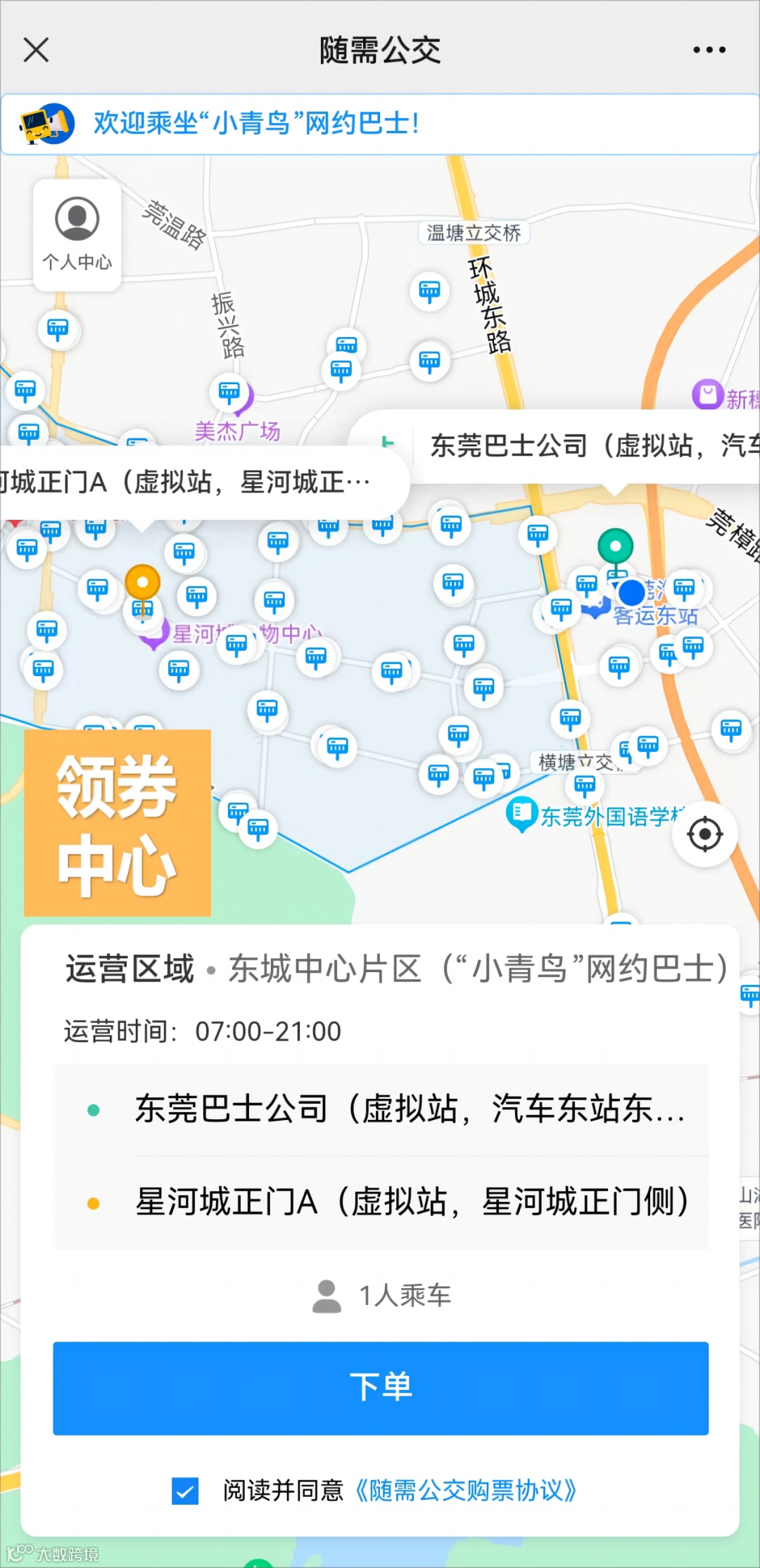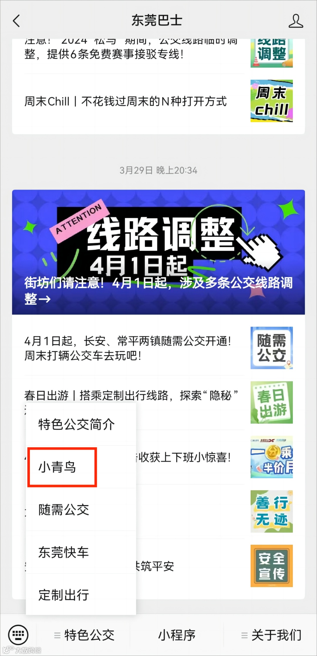 打开“东莞巴士”微信公众号—特色公交—小青鸟,选择区域后输入上下车站点、人数,完成支付。