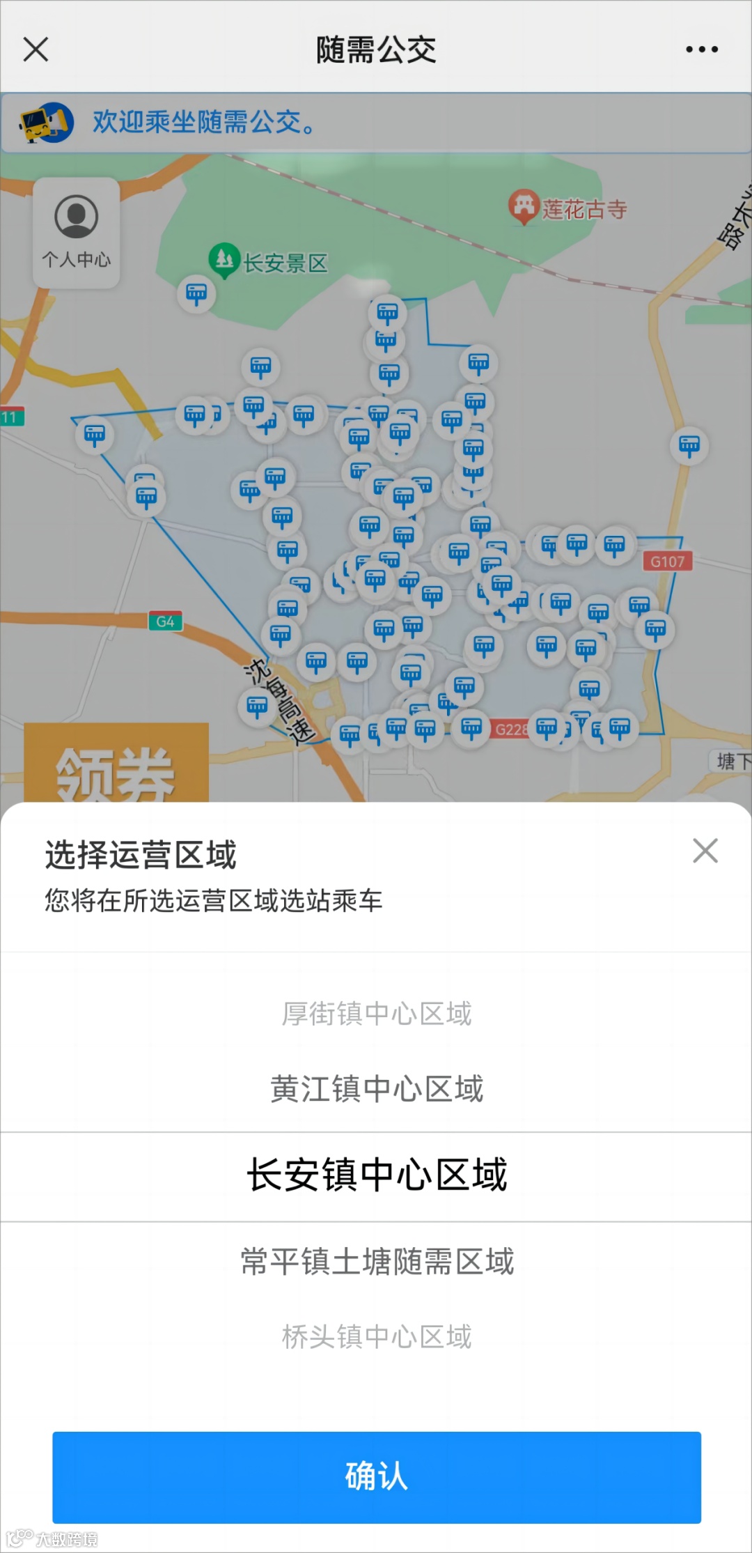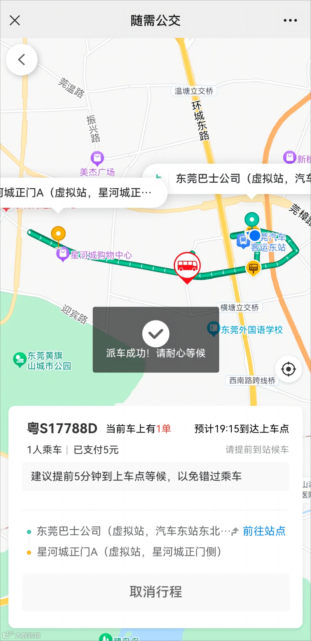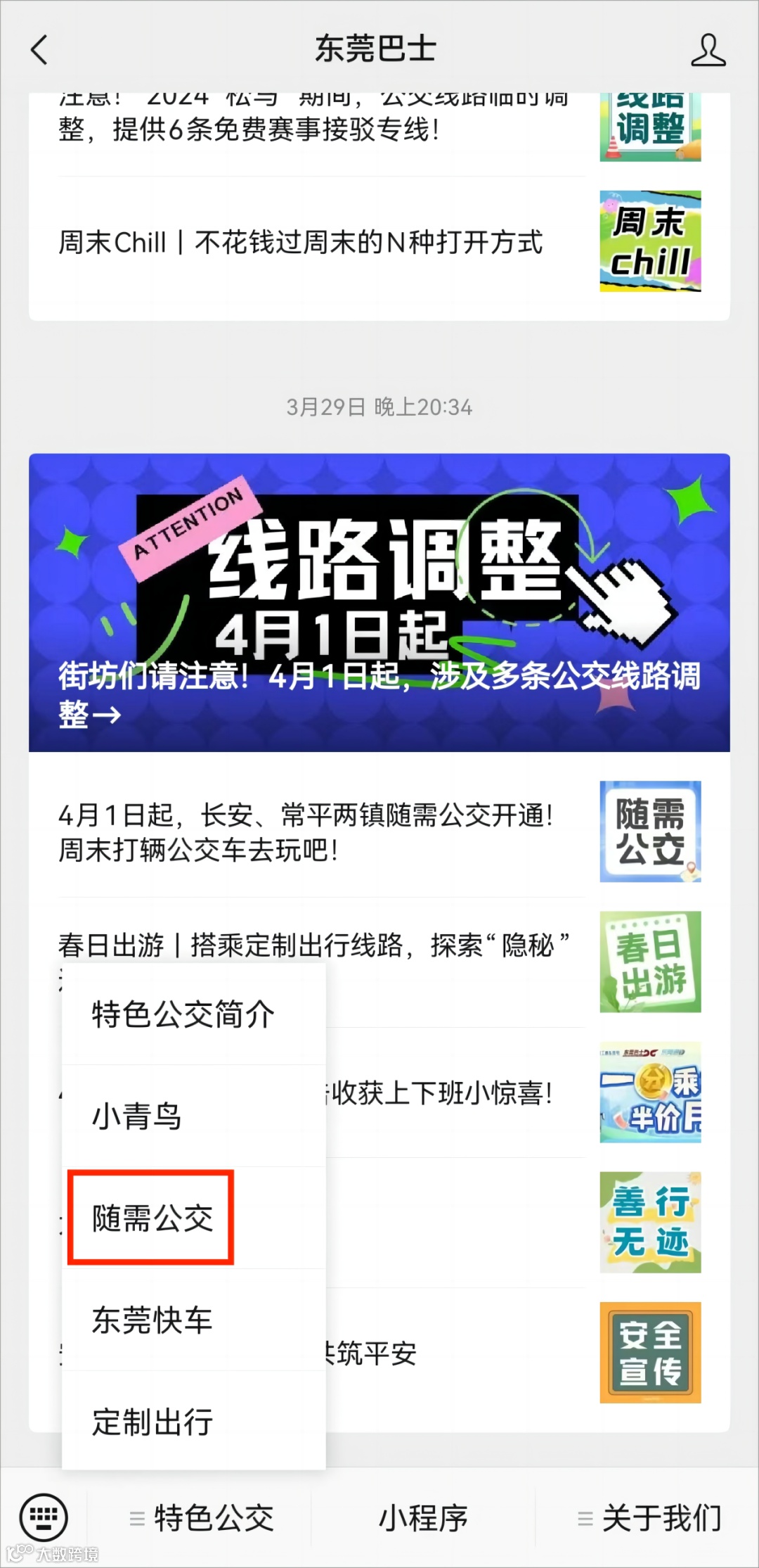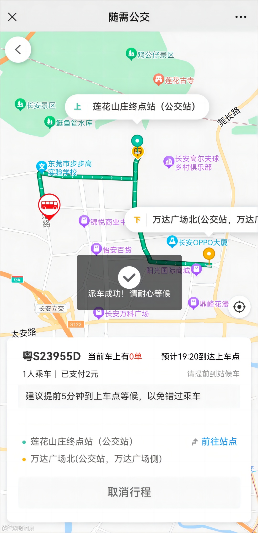 打开“东莞巴士”微信公众号—特色公交—随需公交,选择区域后输入上下车站点、人数,完成支付。