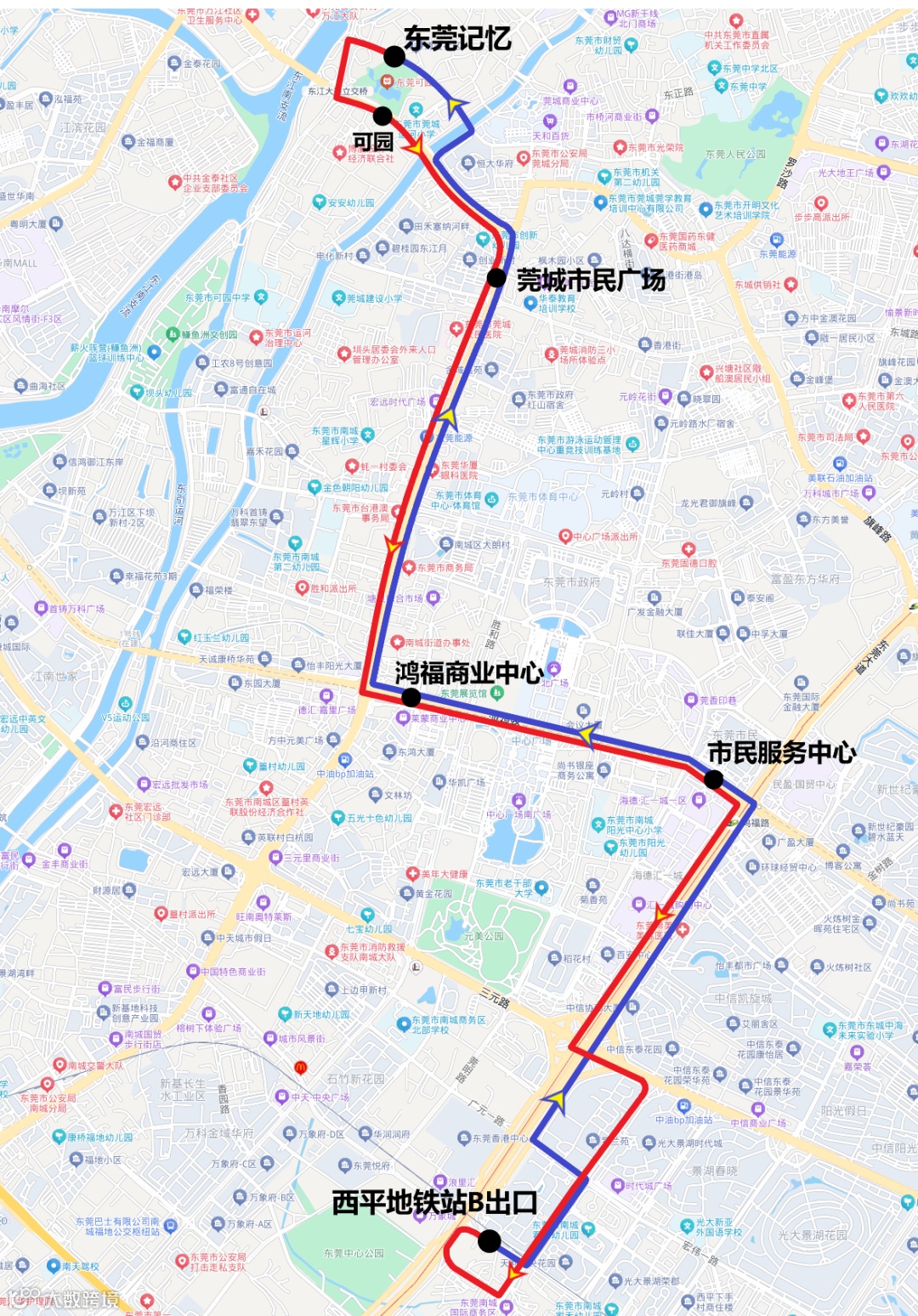 东莞记忆→可园→莞城市民广场→鸿福商业中心→市民服务中心→西平地铁站B出口→市民服务中心→鸿福商业中心→莞城市民广场→东莞记忆