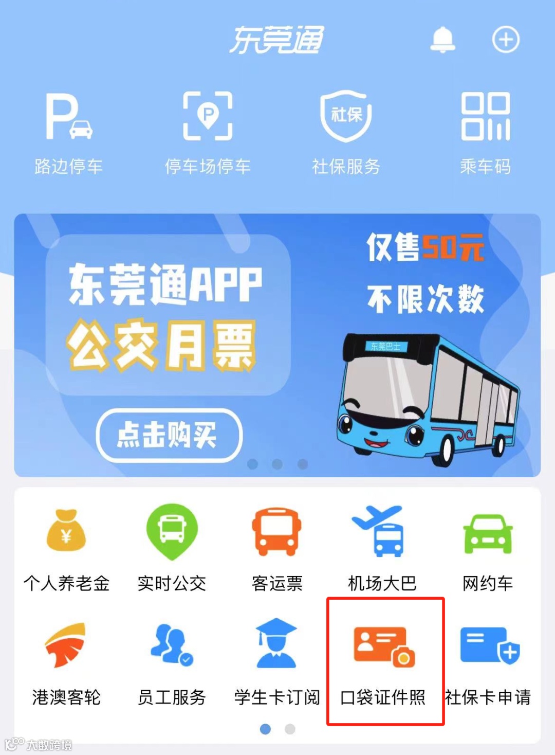 ① 东莞通APP首页进入【口袋证件照】。