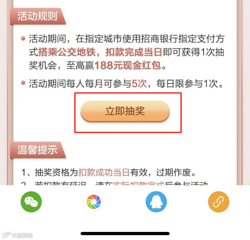 1. 活动期间,使用招商银行乘车码搭乘东莞公交、地铁,扣款完成当日即可获得1次抽奖机会,至高赢188元现金红包。