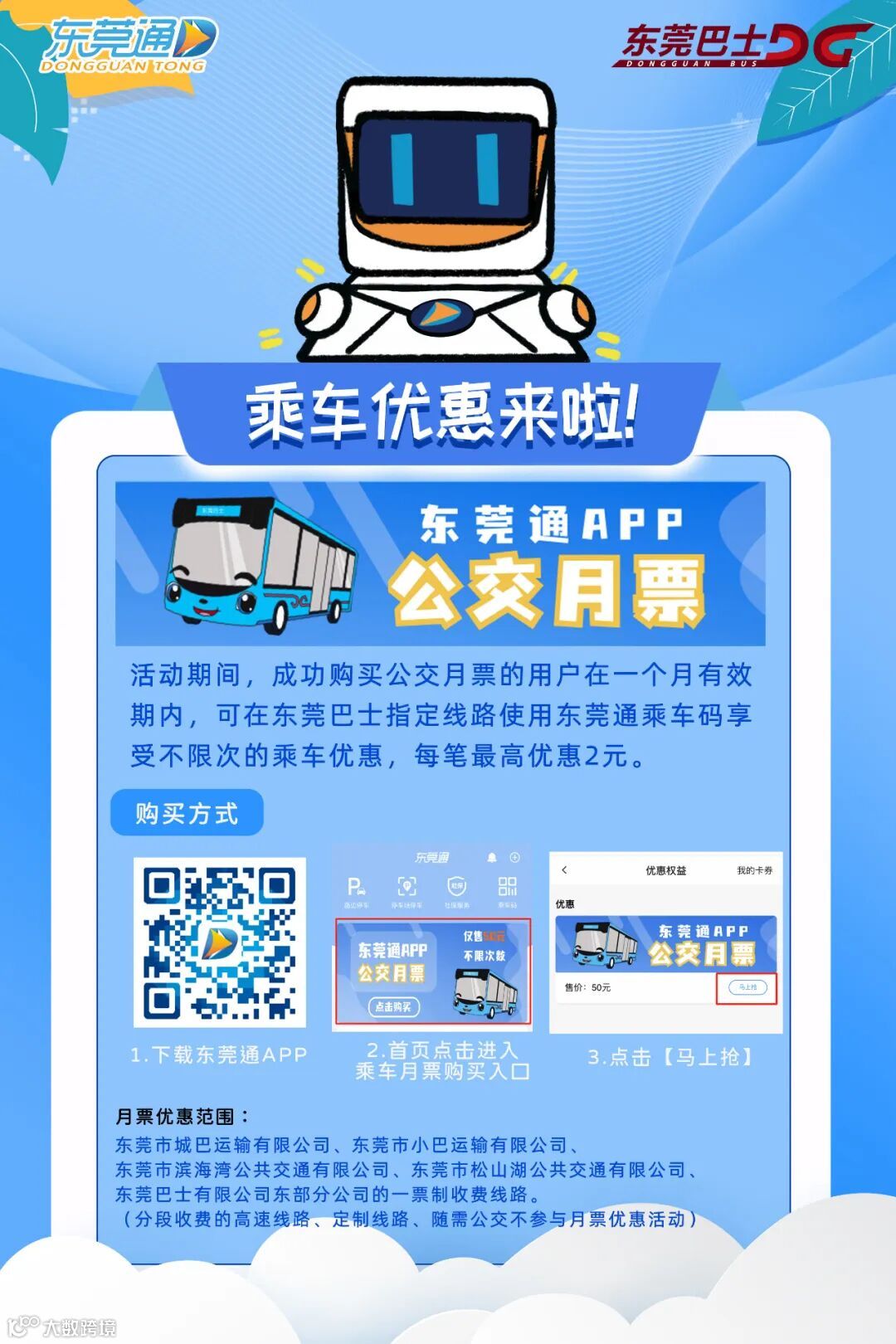 活动期间,市民可在东莞通APP购买公交月票,仅售50元❗️在月票有效期内(自购买之日起一个月内),已购买公交月票的用户可在东莞巴士一票制收费线路不限次享受每次乘车减2元的优惠😍