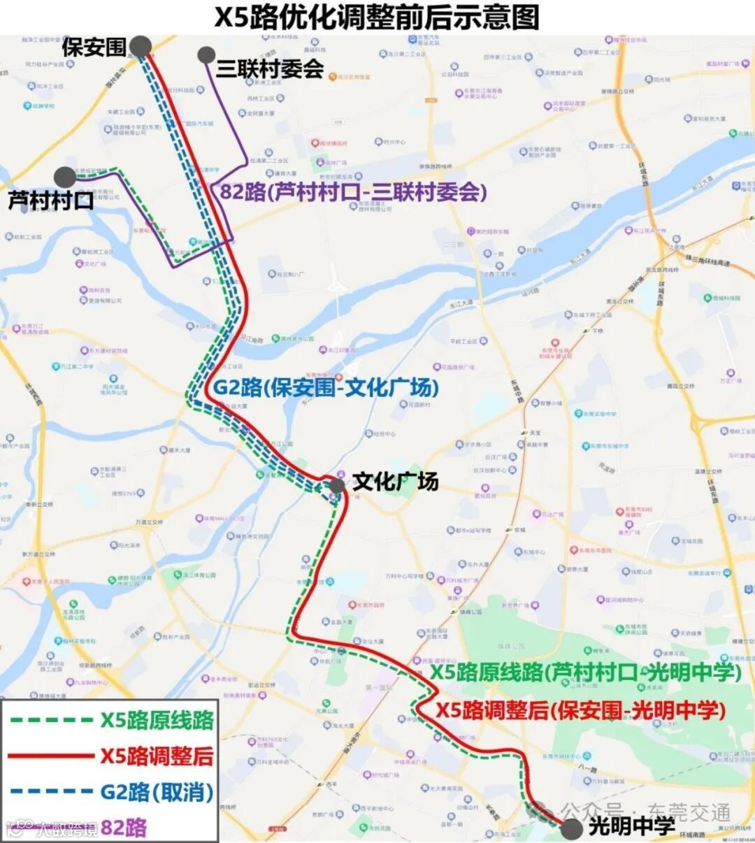 X5路 起讫点调整为“保安围至光明中学”,双向取消停靠“芦村村口、欧邓村委会、高埗第一综合市场、高埗邮政局、高埗第二综合市场、嘉荣商场、文华酒店、高埗中心小学、高埗电信大楼”站,新增停靠“高埗交警大队、高埗文化广场、西联小学、朱磡村口、三联村、保安围”站,高、平峰发车间隔调整为25分钟、30分钟。
