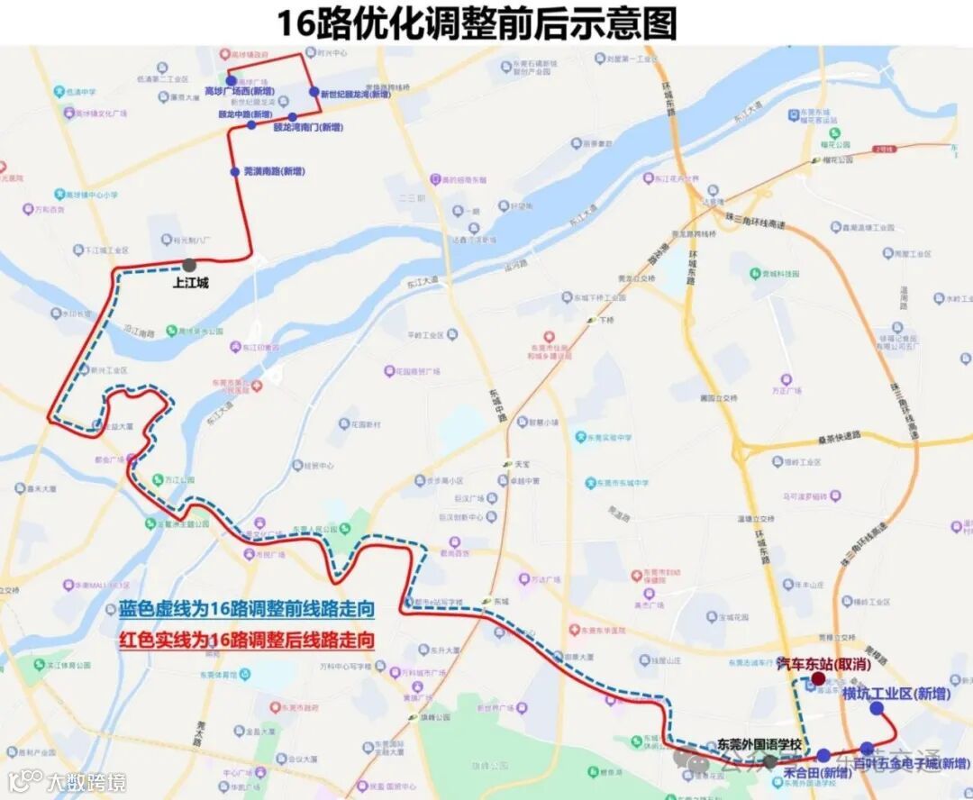 16路 起讫点调整为“横坑工业区至高埗广场西”,上行取消停靠汽车东站,新增停靠“横坑工业区、百业五金电子城、禾合田、莞潢南路、颐龙中路、颐龙湾南门、新世纪颐龙湾、颐龙商业广场、颐龙湾北门、高埗广场西”站,下行取消停靠汽车东站,新增停靠“高埗广场西、新世纪颐龙湾、颐龙湾南门、莞潢南路”站。