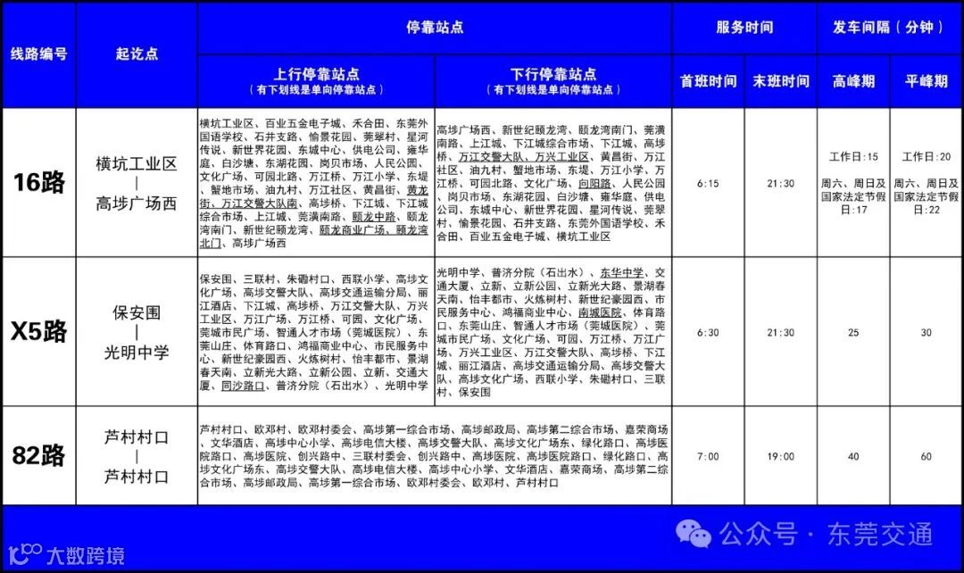 82路 起讫点调整为“芦村村口至芦村村口”的单循环运营模式,双向取消停靠“余屋首末站、余屋、余屋商业二街、帝豪工业区、榴花地铁站、榴花公园、峡口、石碣镇政府、利丰中央华府、石碣医院、阳光城愉景湾、玖颂江湾、联翱科技园、华科城、东江华府、新锐智创北、旭丽电子北、颐龙东路、颐龙湾南门、颐龙中路、凌屋村口、颐龙西路”站,下行取消单向停靠“石碣大桥”站,新增停靠“芦村村口、欧邓村、欧邓村委会、高埗第一综合市场、高埗邮政局、高埗第二综合市场、嘉荣商场、文华酒店、高埗中心小学、高埗电信大楼”站,服务时间调整为7:00-19:00,高、平峰发车间隔调整为40分钟、60分钟。