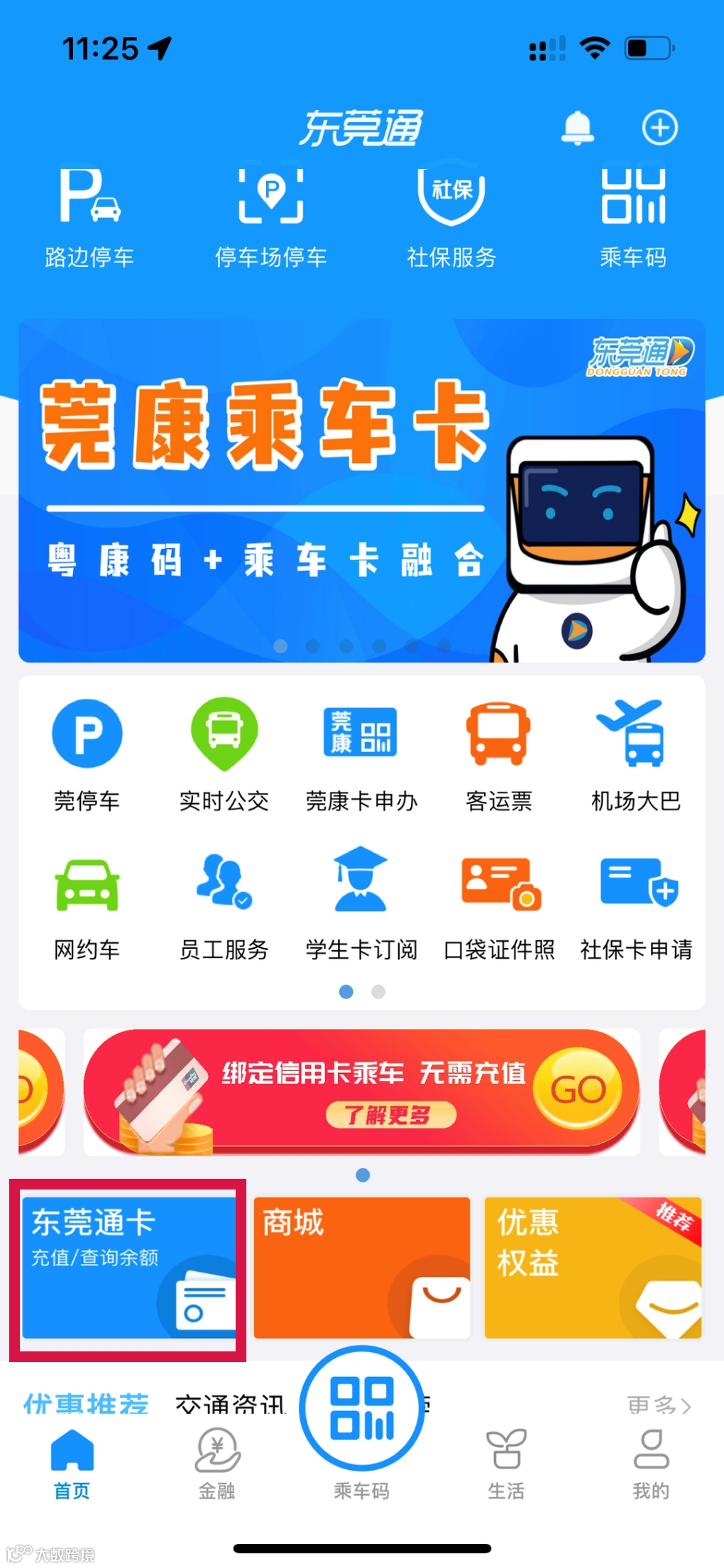 1、打开东莞通APP首页【东莞通卡】