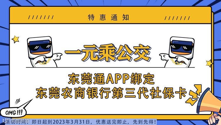 活动期间,在东莞通APP上绑定东莞农商银行第三代社保卡的用户即可享受扫码一元乘公交地铁,每天享2次!