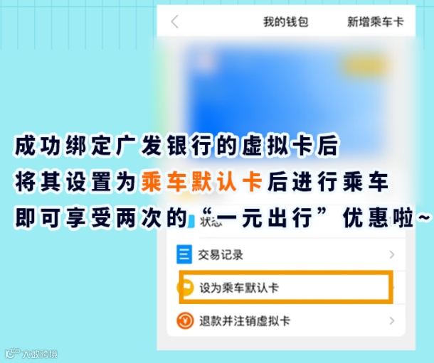 温馨提示:活动期间,广发银行虚拟卡老用户销户并重新开通虚拟卡不重复享受“一元出行”优惠;如于活动前期已享有2次公交优惠的,则此次新增地铁范围的优惠则无法重复享受。